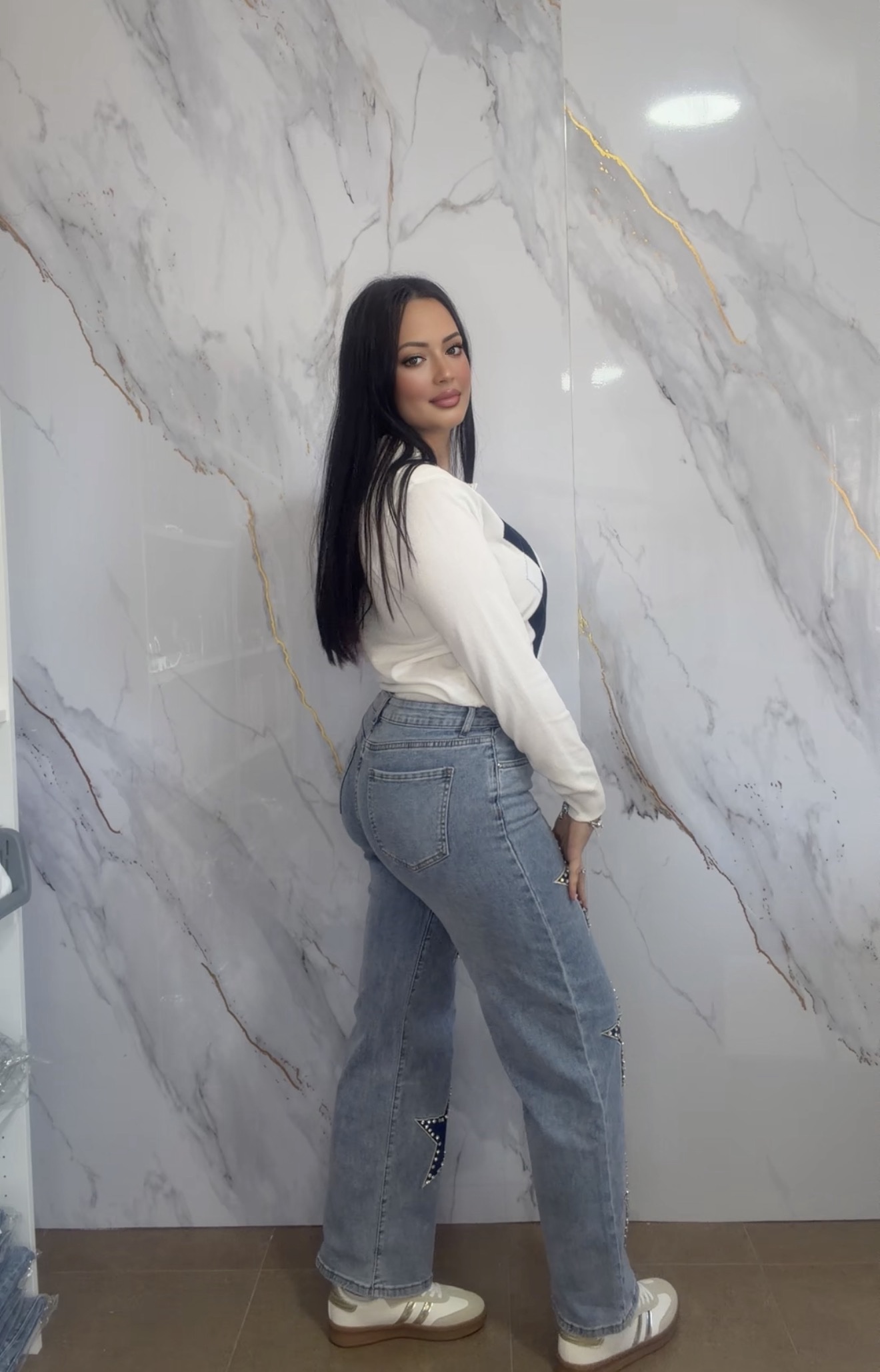 precioso vaquero de tiro alto con mucha elastan con detalles de estrellas con brillito, por detrás es liso llevo talla 40